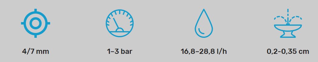 Parametry: hadice:4/7mm tlak: 1-3 bar průtok: 16,8-28,8 l/h dosah: 0,6-0,8 m