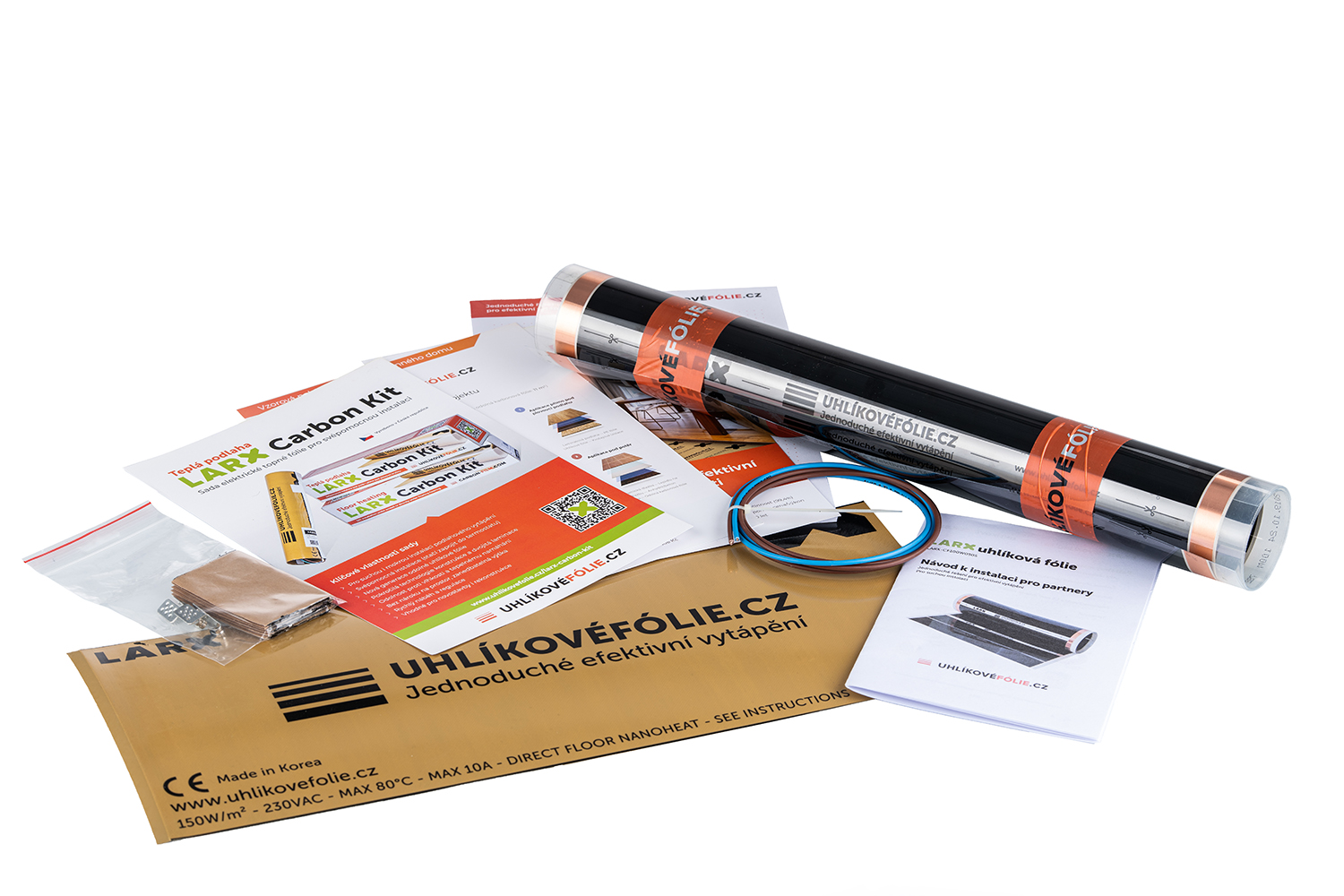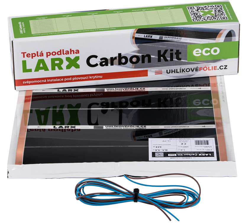 LARX Carbon Kit je hotové a připravené řešení pro podlahové vytápění.Základem je LARX odolná uhlíková fólie, profesionálně izolovaná, s konektory a přívodními vodiči délky 3m.