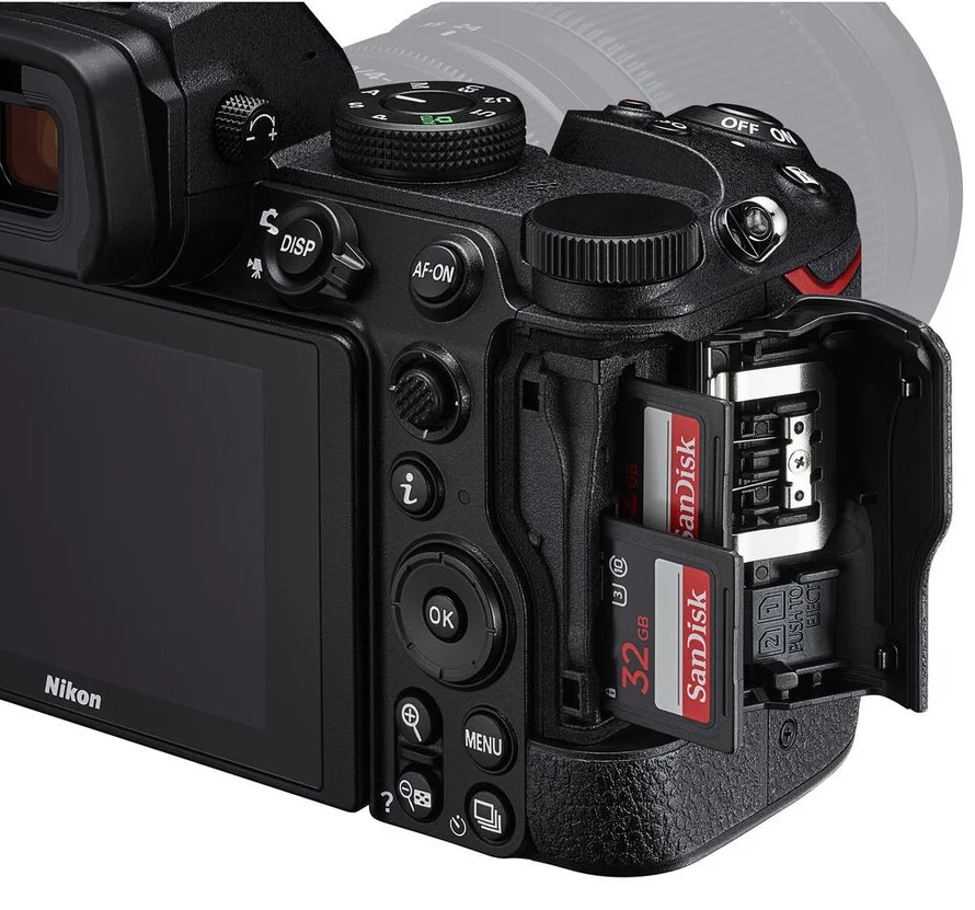 Pro ukládání záznamu jsou zde dva sloty SD (UHS-II) paměťových karet. Aplikace Nikon SnapBridge pro přenos záznamu a dálkové ovládání. Váha 590 g.