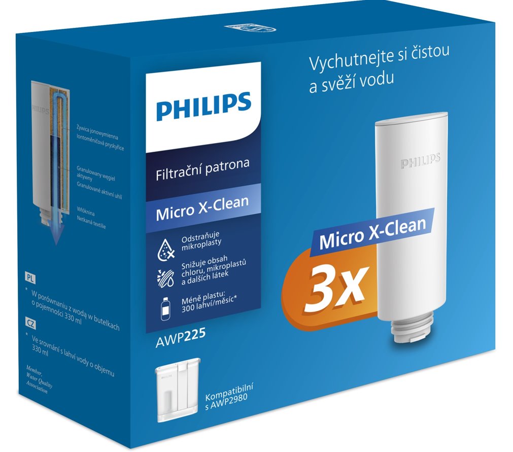Okamžitý filtr vody Philips Micro X-Clean filtruje za pomoci vysoce porézních vláken z aktivního uhlíku. Vodu z vodovodu tak snížením obsahu chlóru, olova, pesticidů a mikroplastů přemění ve vodu čistou a lahodnou.