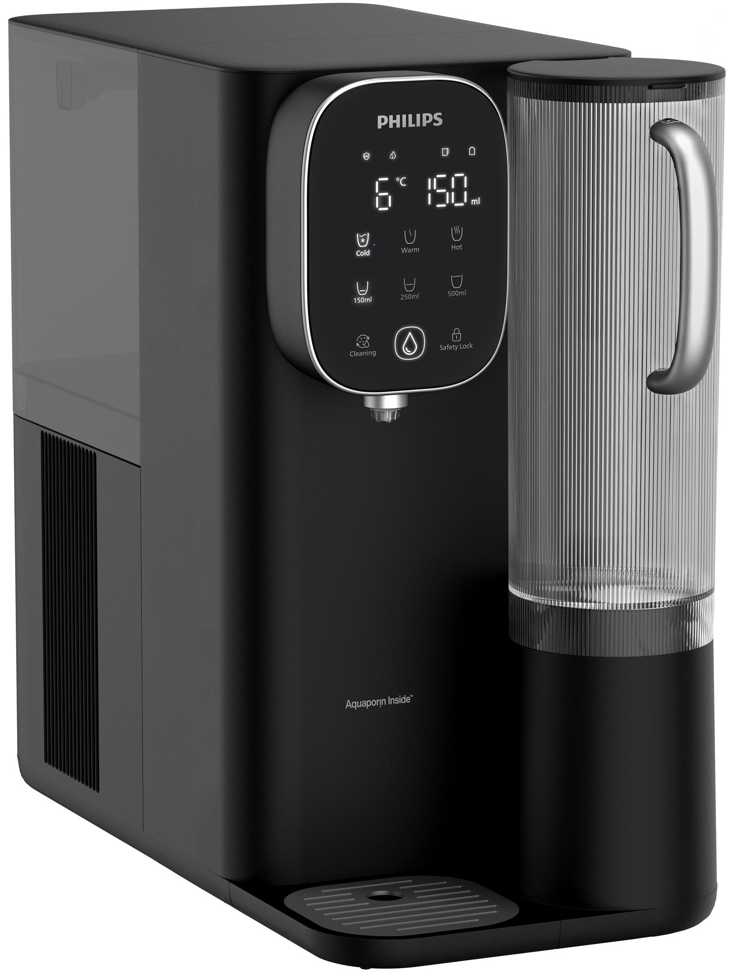 Philips ADD6912BK/10 je kompaktní a elegantní stolní automat na vodu s technologií reverzní osmózy Aquaporin Inside™, kompresorovým chlazením a průtokovým ohřevem až na bod varu. Nabízí šest nastavitelných teplot od ledově studené po vroucí, alkalickou mineralizaci pro lepší chuť a funkce zajišťující vysokou hygienu. Je navržen pro pohodlné rodinné použití i náročné uživatele, kteří chtějí mít vždy po ruce čerstvou, bezpečnou a chutnou vodu. Má ukazatel TDS (celkového množství látek rozpuštěných ve vodě) před a po filtraci.