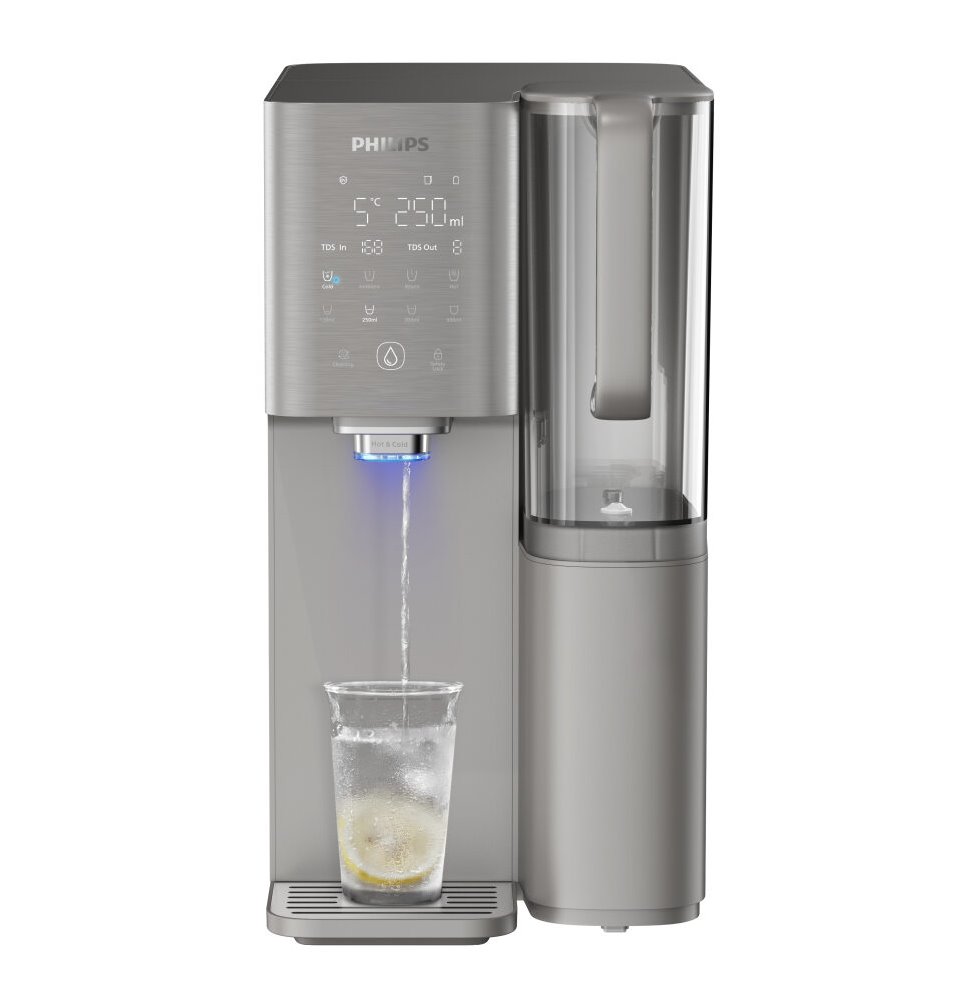 Philips ADD6921DG je stolní výdejník vody s pokročilou filtrací reverzní osmózou Aquaporin Inside™, kompresorovým chlazením a průtokovým ohřevem až na bod varu. Nabízí šest různých teplot vody, alkalickou mineralizaci pro lepší chuť, UV-C LED ochranu proti bakteriím a praktické funkce pro snadné a bezpečné používání. Ideální pro rodiny i náročné uživatele, kteří chtějí mít k dispozici vždy čerstvou, kvalitní a chutnou vodu.