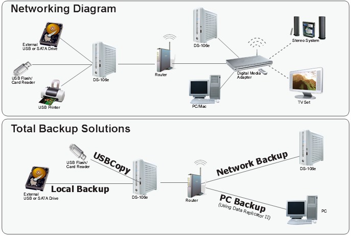 Zálohování je velice jednoduché a automatické. Pomocí dodávaného programu Data Replicator lze provádět jak jednorázové, tak i automatické zálohy pracovních stanic. Zálohovat lze jak přímo na Disk Station, tak i na USB nebo eSATA disk připojený k DS-106e. Samotný DiskStation lze zálohovat buď lokálně na externí disk nebo síťově na jiný DiskStation.